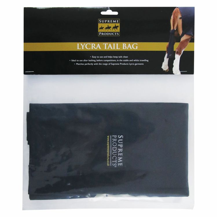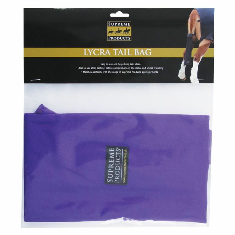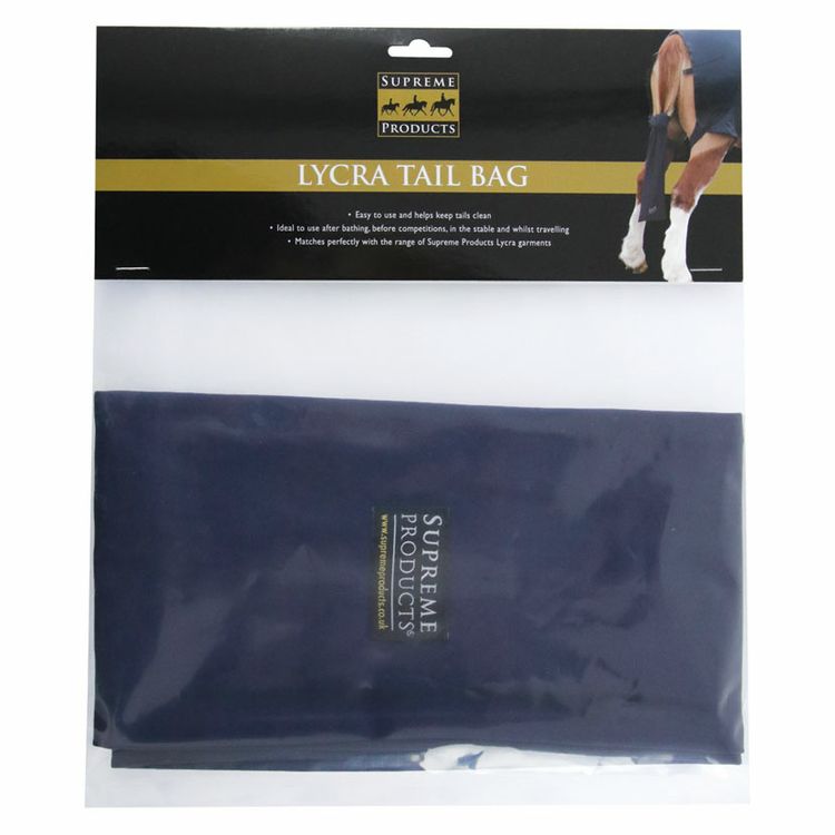 The Supreme Products Lycra Tail Bag is easy to use and helps keep tails clean. Ideal to use after bathing, before competitions, in the stable and whilst traveling. Simply plait your horses tail, place inside the bag and thread the ties through the plait at the base to secure in place. Matches perfectly with the other Supreme Products Lycra garments in the range, available in Navy, Black, Purple, Red and Orange.