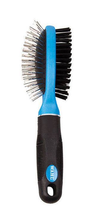A dual purpose grooming tool, this double sided brush is designed for general brushing. The ball pins assist in removing debris and tangles from the coat. The soft nylon bristles remove loose hair and stimulates the natural oils in the coat to improve the general health and appearance. Ideal for short and medium coats and has a durable, non-slip rubber grip handle.