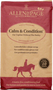 Providing slow release, stamina-giving energy, Allen & Page Calm & Condition is a topline feed for horses and ponies at rest or engaged in hard work as well as for poor doers that struggle to gain and maintain their weight. High in fibre and low in starch and sugar, this quick soaking, high calorie feed not only gives your horse the energy required, it's also balanced with vitamins and minerals, linseed, prebiotics and probiotics.