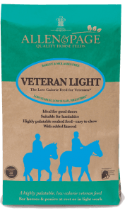 Allen & Page Veteran Light is a high fibre feed for older horses at rest, light workers and good doers as well as horses and ponies prone to laminitis. High in fibre and a great source of calories and energy, this quick soaking horse feed for fussy feeders is packed with vitamins and minerals as well as pre and probiotics, linseed for Omega 3 and is suitable for horse with intolerances to barley, molasses, alfalfa and soya.