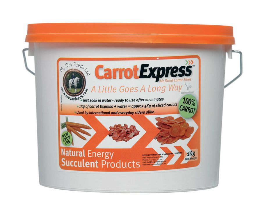 Air-dried carrot pieces. Just soak to use. Ready in 20 minutes. Contains no artificial colourings or flavourings. Tempts fussy feeders and is a great source of natural energy. 6kg size is equivalent to 30kg of raw carrot. Also ideal for alpacas or pets such as rabbits and guinea pigs.