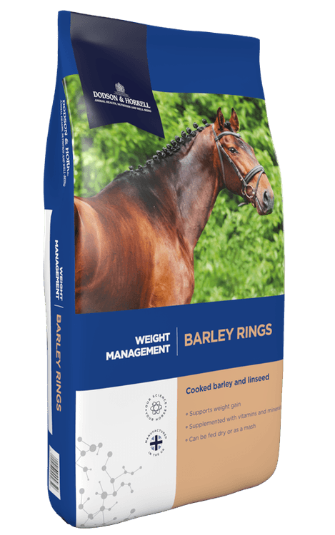 Dodson & Horrell Barley Rings is a cooked barley and linseed feed, supplemented with vitamins and minerals for adult horses and ponies that need to gain weight. Easy to feed with no mess, it's scientifically balanced to correct natural imbalances of barley and is also high in oil and protein to optimise weight gain, condition and topline. Can be fed dry or soaked to make a highly palatable mash.