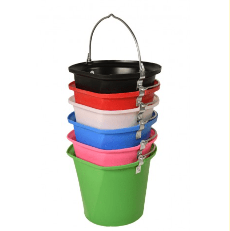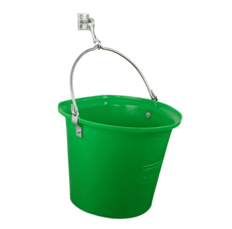 Shaped to aid wall hanging and to avoid slopping down your leg when carried full of water. The recess in the base improves stability on the ground and provides a convenient finger grip when tipping. Heavy-duty STUBBYTHENE moulding fitted with a thick galvanised handle shaped to aid hanging from our S85PS Trigger Hook on Wall Plate making it much safer with little risk of a horse hooking a lip in this one. Recommend this change to all users!
