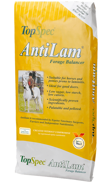 TopSpec AntiLam Forage Balancer is a highly palatable, pelleted multi-supplement to provide nutritional support for horses and ponies susceptible to, being treated for, and recovering from laminitis. Made with a high fibre, very low-calorie composition, it can be used as part of a calorie controlled diet when weight loss requirement is necessary.
