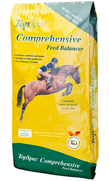 TopSpec Comprehensive Feed Balancer for horses is a nutrient-rich, very palatable, pelleted feed that's high in protein and filled with supplements to promote muscle development and topline. It contains a broad-spectrum supplement and many specialised supplements including a hoof supplement, anti-oxidants and digestive aids. When this feed balancer is used there is often no need to add any further supplements, other than salt and/or electrolytes for sweating horses.