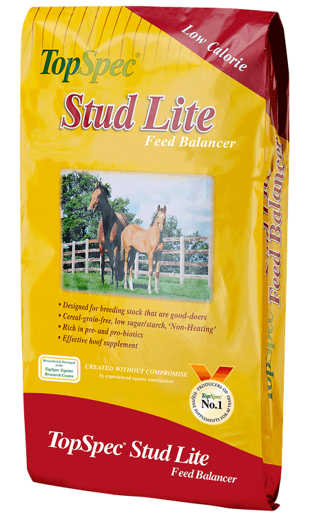 TopSpec Stud Lite Feed Balancer for horses is a highly palatable, 'Non-Heating', low calorie feed formulated for breeding stock such as stallions, broodmares, foals and youngstock. It contains a multi-supplement including the levels of micronutrients and digestive aids normally only found in high quality specialised supplements. The low sugar and starch formula will support healthy muscle and skeletal development without the excess calories while also improving hoof quality, making the skin more supple skin and helping to create an incredibly shiny coat.