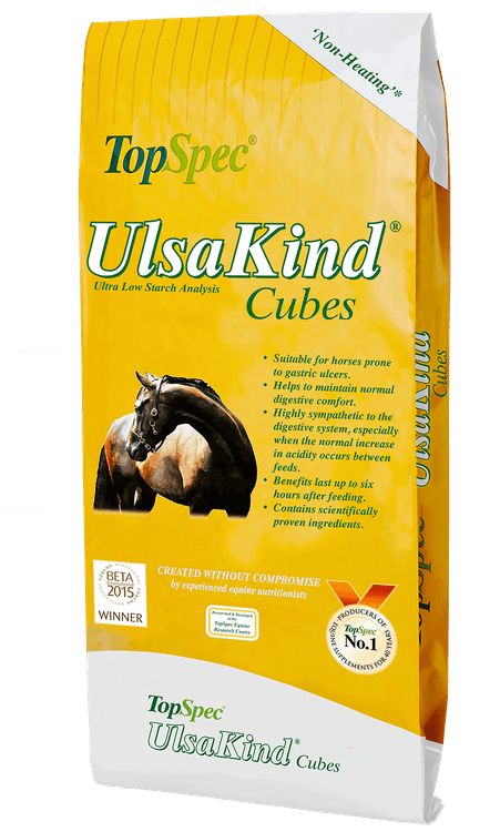 The TopSpec UlsaKind Stomach Support Cubes are scientifically formulated to maintain normal digestive health and support horses that suffer from stomach lining erosion. Suitable for horses that are prone to gastric ulcers and aiding instances when normal acidity increases between feeds, these cubes contain very high levels of β-glucans, forming a gel and coating the stomach lining with a soothing film. β-glucans also slow the rate of passage of feed and the gel-like stomach contents are less likely to splash the upper squamous epithelium in the stomach.
