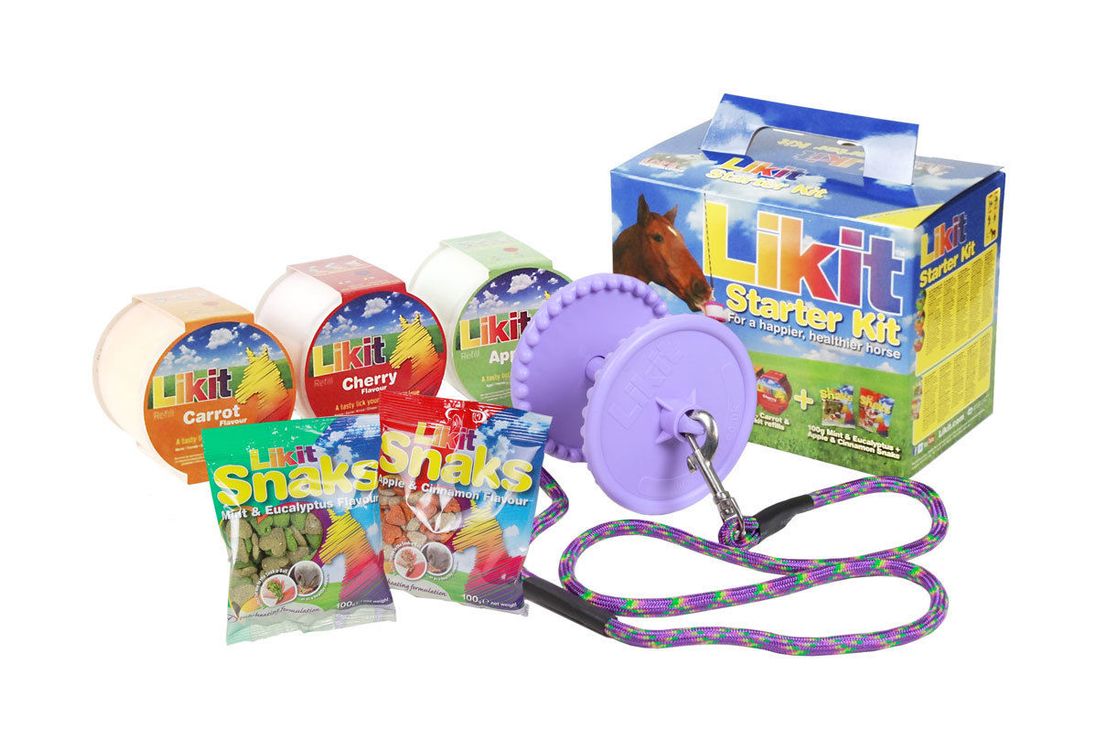 Each Likit Starter Kit contains a Likit Holder, three assorted Likit (650g) refills in Apple, Carrot and Cherry flavours as well as two bags of our popular 100g Likit Snaks, one in Apple & Cinnamon and the other in Mint & Eucalyptus flavour.