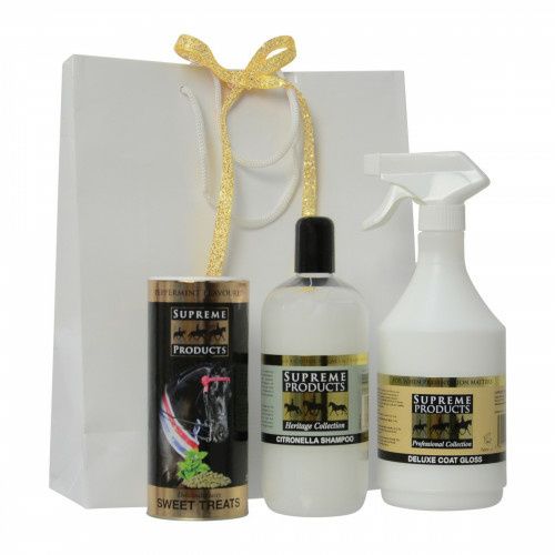 The Supreme Products White Gift Bag is the ideal equestrian gift. This gift set is perfect for pampering any horse or pony and includes coat gloss, citronella shampoo, and some tasty treats.