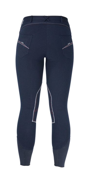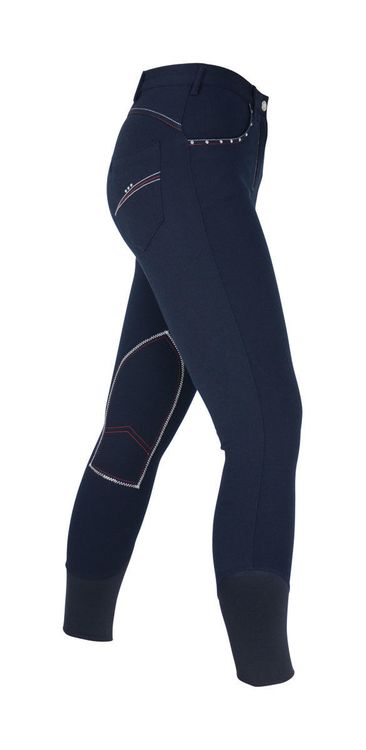 Dazzle in these navy breeches with contrast red and white stitching featuring crystal diamantes on the front and rear pockets. No bulk elastic stretch hem at the ankle.