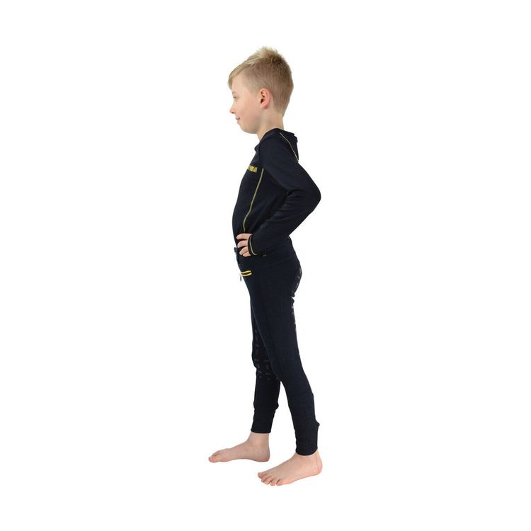 These smart navy blue breeches with contrasting yellow top-stitching and Little Knight emblem on the back are made from stretch cotton and match the rest of the Little Knight range for a coordinated look. They have two zipped pockets at the front, a full silicone seat in the Little Knight logo to aid grip in the saddle and no-bulk ankles for comfort inside long boots.