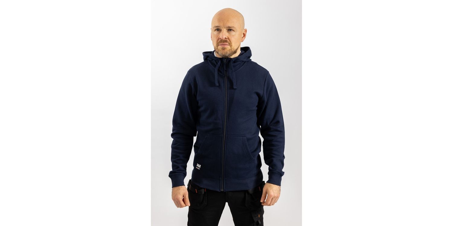 Crafted from a soft cotton-polyester blend, the hoodie features a brushed interior for extra comfort, a sturdy front zipper, and adjustable drawstring hood for a custom fit. Ribbed cuffs and hem help retain warmth, while the minimalist Helly Hansen logo adds a sleek, professional finish, perfect for both on and off the job.