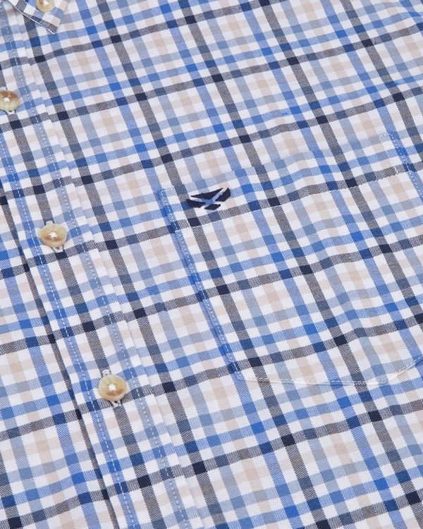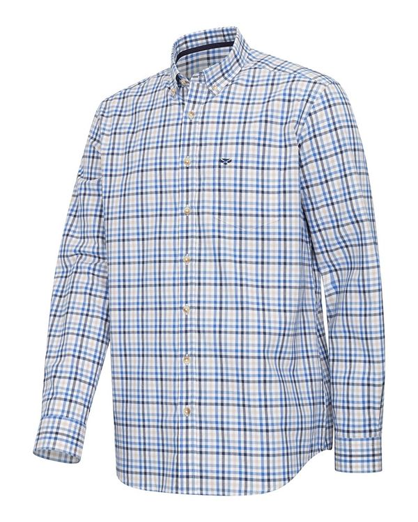 Tailored from a from a top quality 100% cotton fabric, the Hoggs of Fife, Mens Garvock Twill Herringbone Blue/Gold Shirt, has a light ecru base and a crisp, classic grid check giving a really sharp country look and pairing brilliantly with our Stenton fleece.