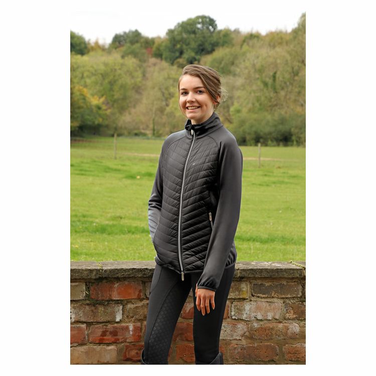This striking jacket is the perfect item to wear as a layer when required. It features a quilted front and back for warmth, soft jersey material side panels and arms for comfort and a fashionable silver two way zip for adjustability. With the Hy Equestrian logo on the chest and to the back collar, practical zipped pockets and snug thumb hole cuffs. Matches the Synergy collection.