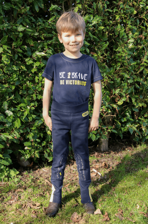 This lightweight, breathable cotton t-shirt is perfect worn alone in the summer months or as a layer when it’s colder! This navy t-shirt features yellow stitching and the ‘Be Brave, Be Victorious’ slogan on the front of the t-shirt. Little Knight logo features on the back of the top near the neck.