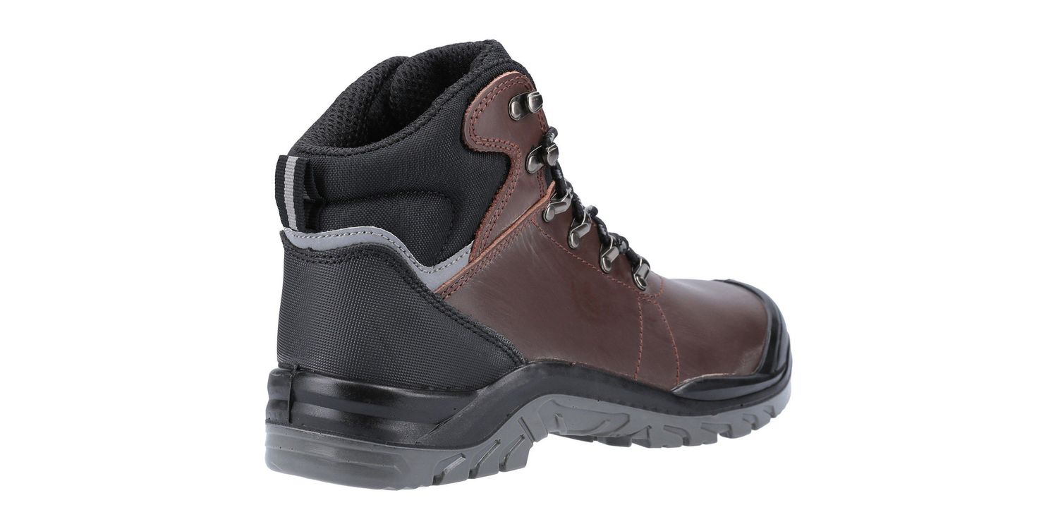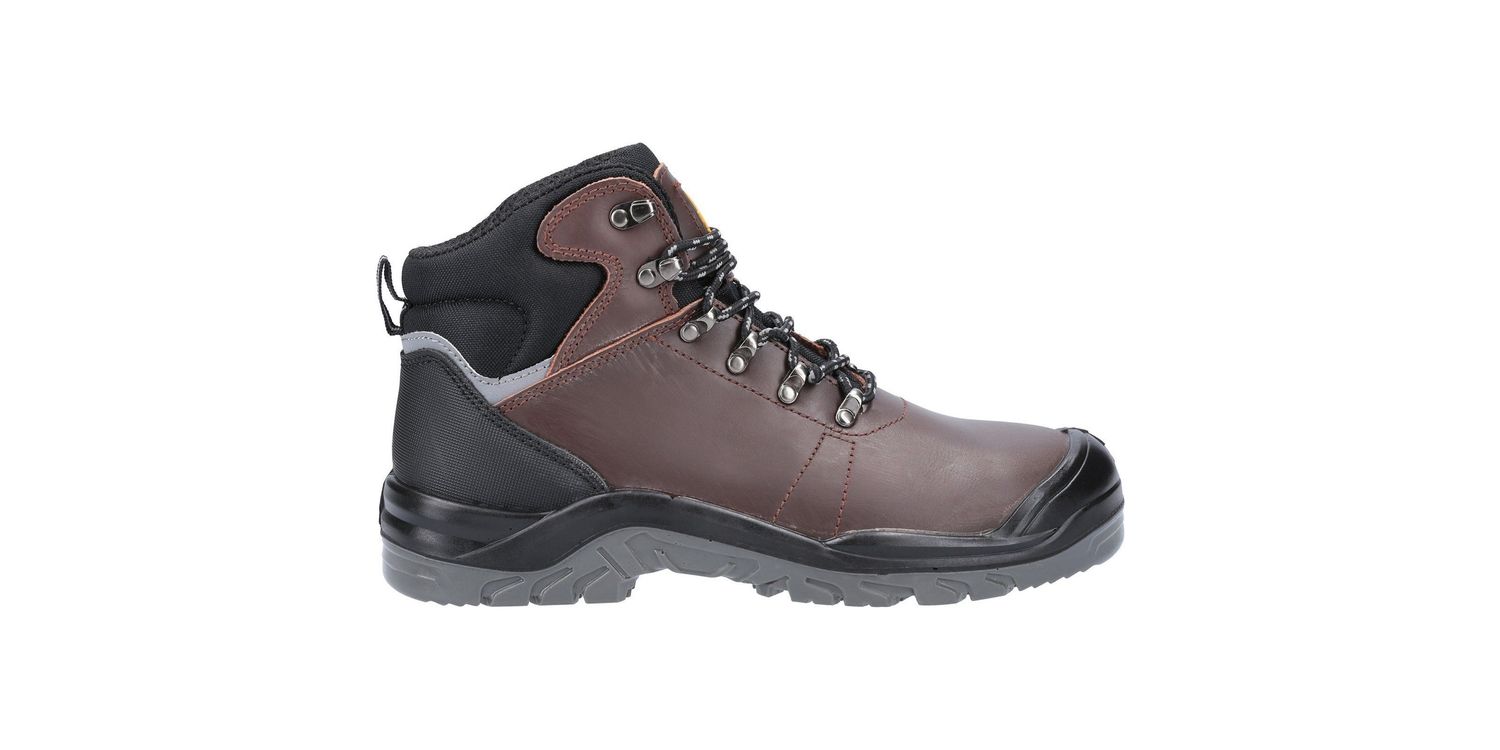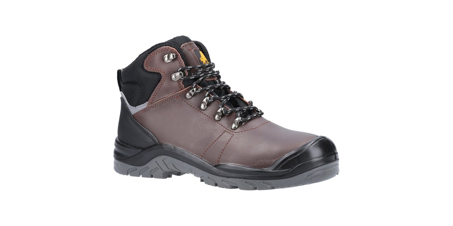 The Amblers AS203 Laymore Men's Water Resistant Boot in Brown is a lightweight safety boot with water resistant Crazyhorse leather upper, heel reflector panel, injected PU scuff cap, steel toe, steel midsole and dual density PU outsole.