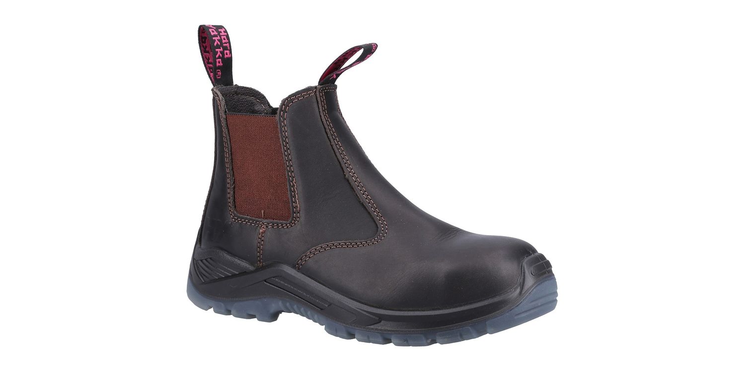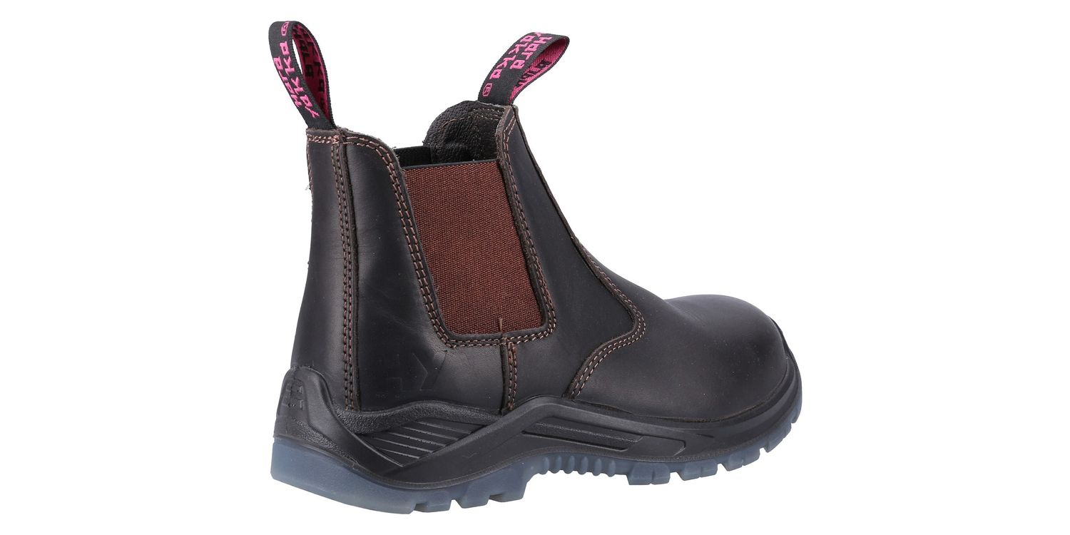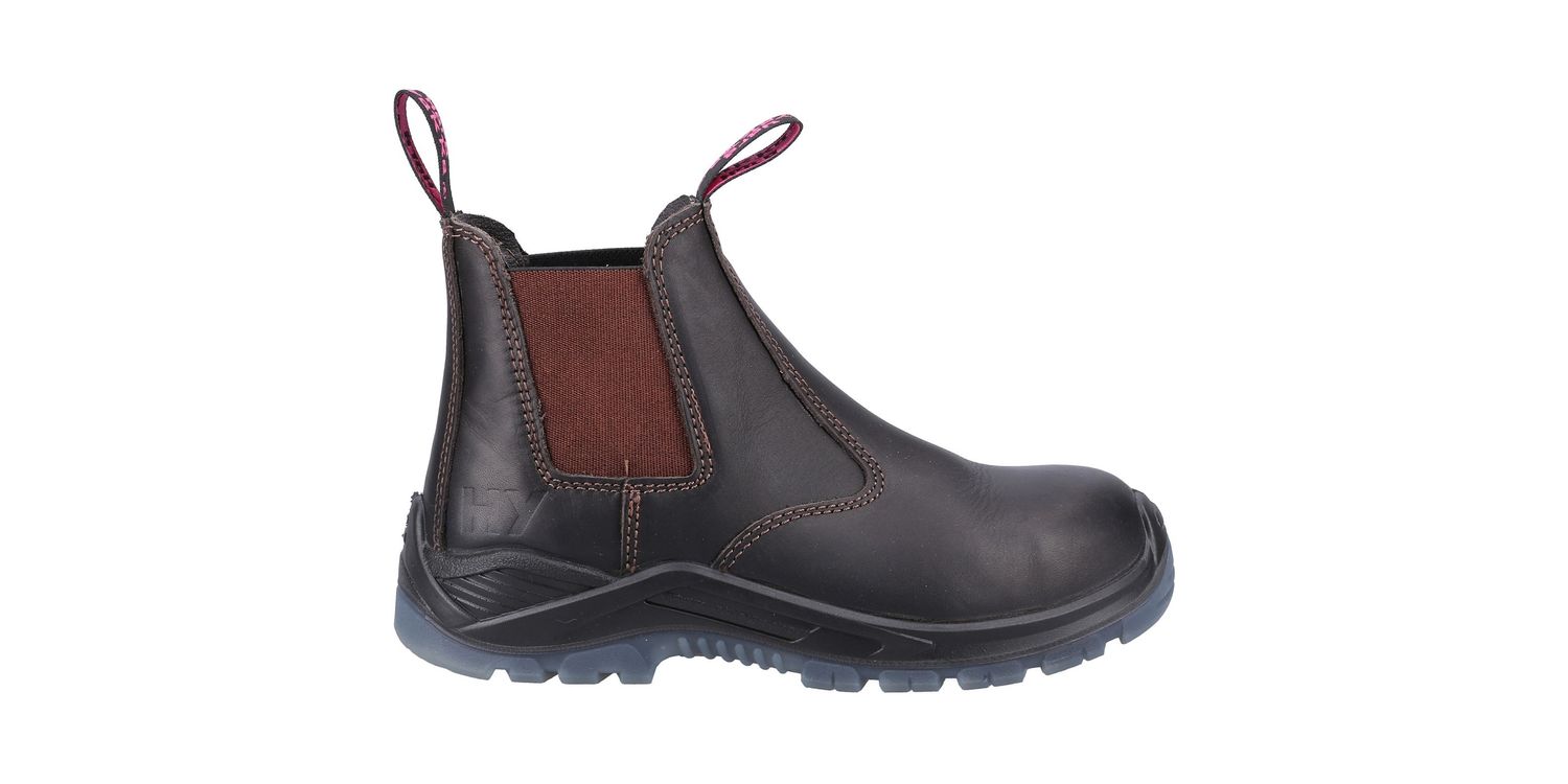 Banjo pull on gusset boot provides safety and comfort, engineered with a water resistant full grain leather upper, PU midsole and recycled pre-consumer TPU outsole endorsed by the Global Recycle Standard (GRS). Genuine Women's Fit.Water resistant full grain leather upperWide profile steel toe capRecycled pre-consumer TPU outsole plateARZ+ heel cushioning