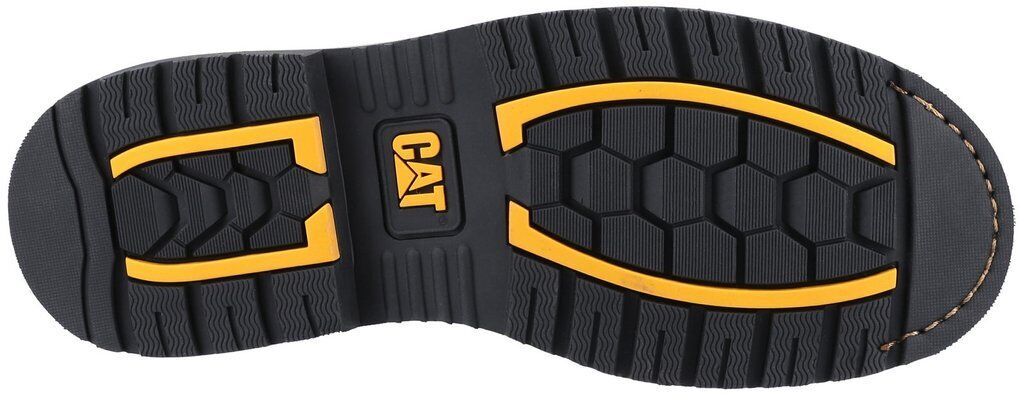 The Powerplant Dealer Safety Boot from Caterpillar features Goodyear Welted Construction and Nitrile Rubber outsole, 200 Joules Steel toe cap, removable PU footbed, padded PU collar, triple-stitched seams, outsole heat resistance to 300°C and an energy absorbent heel.