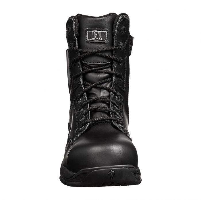 The Magnum Strike Force 8.0 Side-Zip CT CP WP Uniform Black Safety Boot is designed for rigorous environments, offering both durability and comfort. Constructed with a waterproof, full - grain leather upper, these black tactile boots are equipped with a composite toe (CT)  for enhanced protection, without the extra weight of steel.