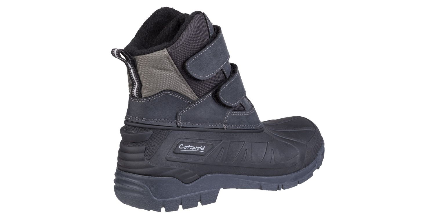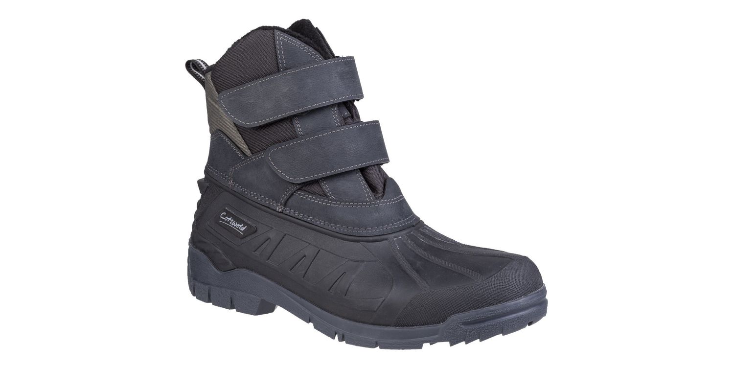 The Cotswold Kempsford Wellington Black Boots offer essential weather protection. For superior stability, these windproof and waterproof men's snow boots have dual touch-fasten straps and a robust chunky rubber galosh non-slip sole. In cold weather, the lightweight, breathable textile upper is padded with fully lined microfiber fleece to keep feet warm. These boots are designed for easy wear and dependable performance, with features such as dual adjustable straps, a flexible gusset tongue, and a canvas rear pull loop.