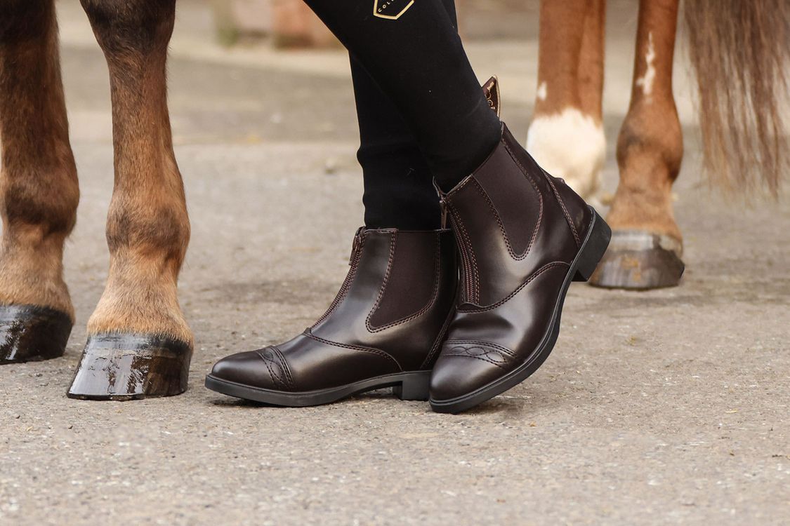 Ideal boot for daily trips to the yard, made from an easy to care for synthetic leather which washes clean with soapy water. Featuring large elastic side panels for comfort and stretch, a large fabric heel puller and front zipper make putting these boots on and off easy, spur stud aids removal of the boots as well as keeping your spurs in the correct position, corrosion resistant YKK zipper and a shock absorbing insole.