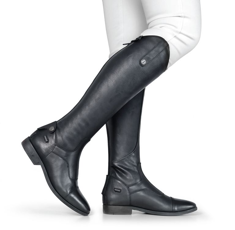 Perfect for competition, training or everyday use, the Casperia boot offers a sleek appearance with its dress style foot and 3D stretch calf which comfortably hugs the leg. Features a genuine leather foot for durability and comfort, genuine leather patch on inside leg aids grip and helps the boot retain its shape in storage, smooth dressage style foot is easy to keep clean and gives a streamlined appearance, high-cut Spanish top line to elongate the leg, slimline non-slip rubber sole for close contact feel, simple side strap with Brogini 'B' badge, rear zip cover on heel protects your zips from any spur damage, top zip cover keeps the zip from falling down and spur studs on either side of the heel keep spurs stable. Fits true to size, but if you have wider feet you may benefit from going up a foot size. The width of the boots can stretch up to 1cm from the size listed in the size chart due to the nature of the synthetic stretch.