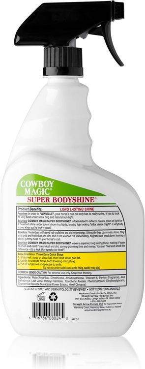Cowboy Magic Super Bodyshine contains all-natural ingredients, which have been designed to give your horse's coat an unparalleled shine. It reflects light off hair while controlling showring and stable dust. Formulated to be fast - acting, this product not only enhances the natural luster of the hair but also repels dust and dirt, keeping your horse cleaner for longer.