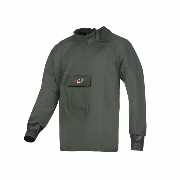 This smock features a short and straight collar, a patched chest pocket and raglan sleeves with adjustable latex cuffs.