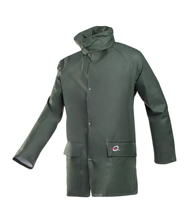 The Flexothane Essential Olive Green Jakarta Jacket features a foldaway hood in collar, zip and press stud closure, two inset pockets, high frequency welded seams.