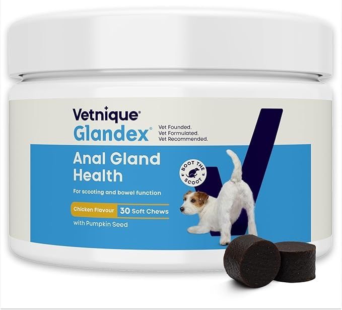 Glandex Soft Chews are a vet-recommended supplement designed to support healthy anal gland function in dogs. Uses a unique fibre blend to support bulky and firm stools to assist the natural emptying of the anal glands every time the pet defecates.