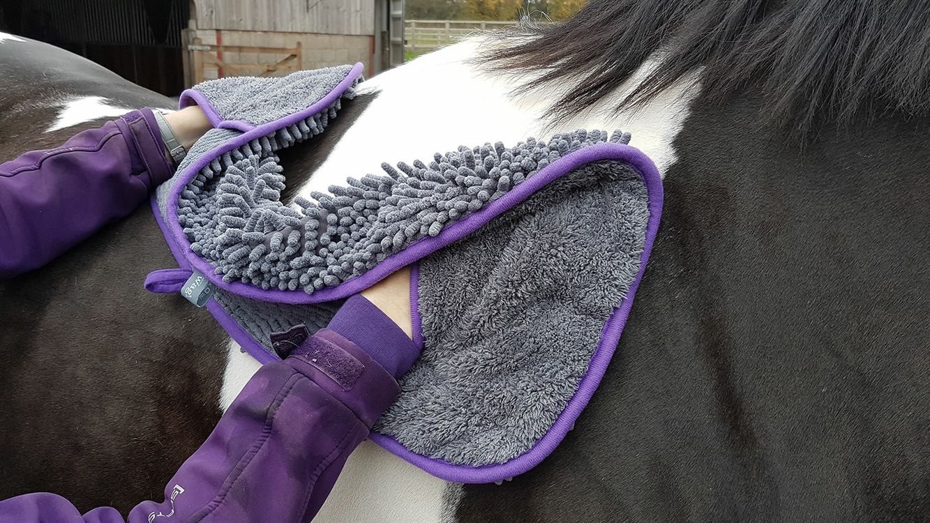 Effectively removes water, mud and dirt from the horse's coat, head and legs. The material absorbs more water and dries more quickly than regular towels. Made with soft, highly absorbent microfibre, making cleaning and drying simple and is effective in removing dirt and water from a horse's lower legs and head. Ideal for use after wet, muddy rides or at events, where washing is not possible, to remove mud and moisture reducing the risks of infection and sores. It can be used to dry around ears and eyes and is great for cleaning sweat after removing the saddle. The soft material does not pull the hair and gives a silky sheen to the coat. Incorporates gloved ends with finger stitching to enable greater control when drying your horse's coat.