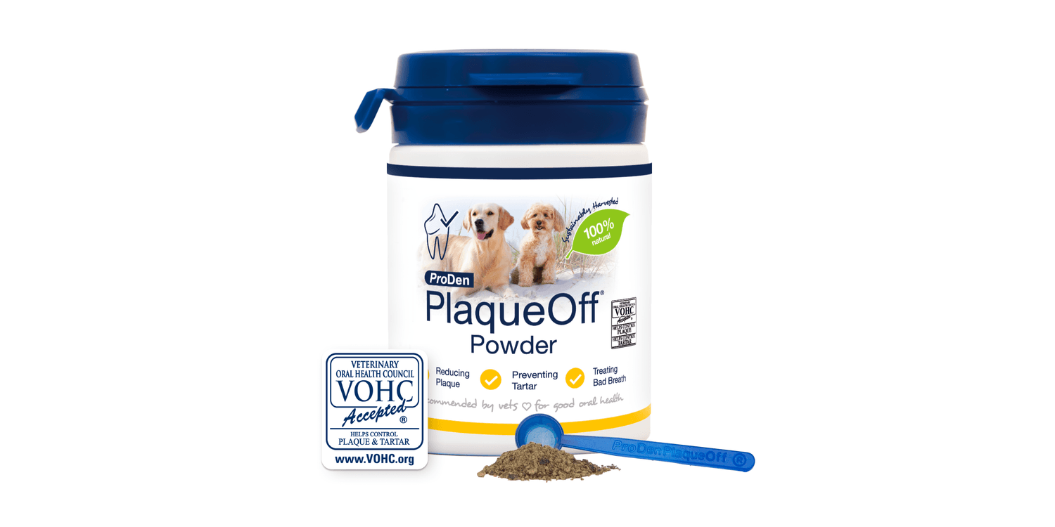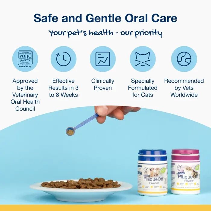 PlaqueOff Powder for Dogs & Cats is a natural daily supplement formulated to support your pet’s oral health, helping to maintain cleaner teeth and fresher breath.