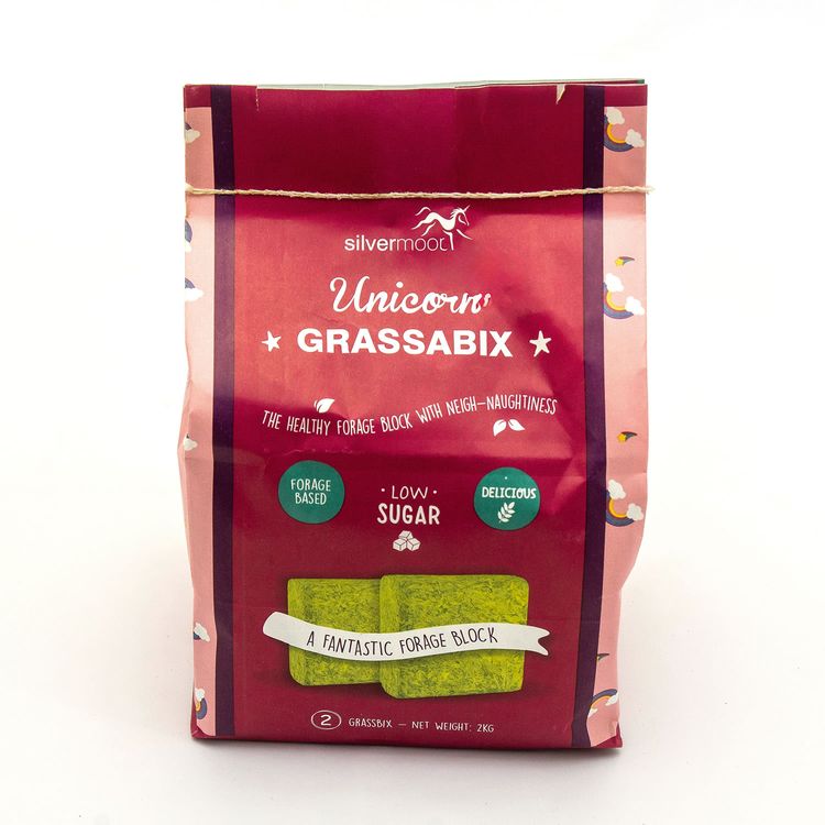 Twin pack healthy forage block with neigh-naughtiness. With a splash of magic and a sprinkle of sparkle this dried grass block will give your four-legged friend a well-deserved treat. This low sugar treat is suitable for laminitics. Each block is 1kg in weight.