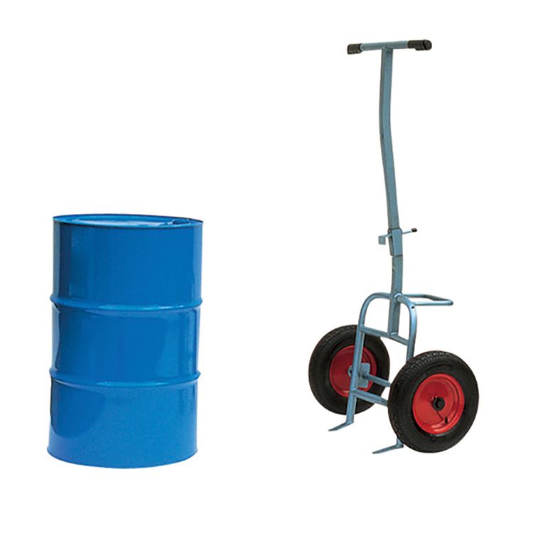 Makes amazingly light work of moving 205lt steel drums up to a weight of 250kg. Drum is automatically drawn onto trolley as the handle is pulled towards you after engaging hook on rim. Blue enamelled steel construction, mounted on 40cm pneumatic tyred wheels. Height 138cm, width 87cm and depth 47cm.