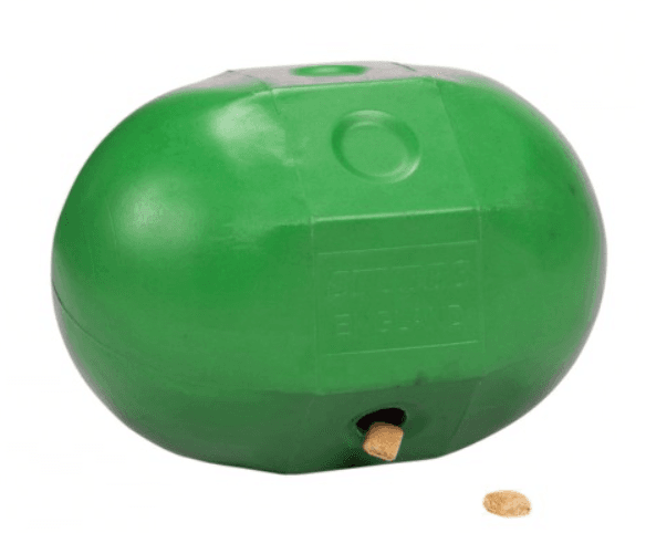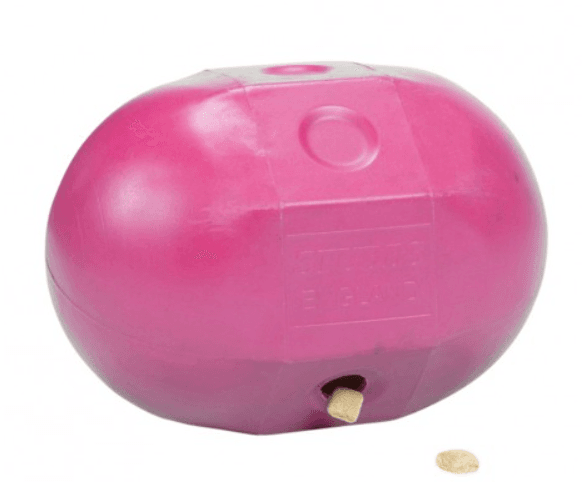 Combining a shape that is difficult to roll in a straight line with a generous size, this dribble treat feeder will keep the horse very busy.