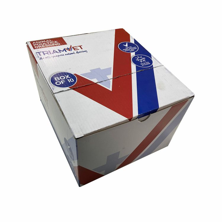 Box of 10 single non-sterile poultice dressings. Can be applied warm and wet, cool and wet or dry. Used for wounds, abscesses, sprains, bruising and more. Dressing to be held in place with a cohesive bandage and changed at least every 12 hours. Poultices are individually wrapped inside the box and can be sold to end users in singles or as a box of 10. Contains Tragacanth 6g and Boric Acid 2g. Poultice size 20 cm x 40cm. For external use only.