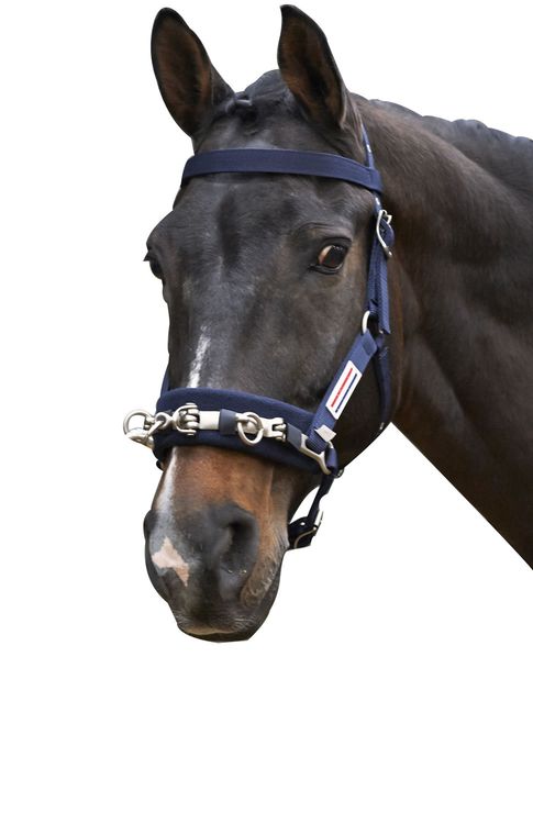 Padded noseband with three lightweight D-rings. Fully adjustable at three points, with a browband to reduce movement when lunging. With brushed silver hardware and rubber branded badge on the cheekpiece.