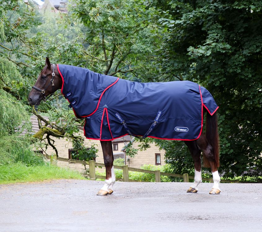 Warm and cosy 250g fill with a faux fur witherpad to alleviate pressure and a waterproof upper to avoid the pad becoming sodden. Includes trigger clip chest fastenings with buckle adjustment and easy replacement, elastic and velcro straps to secure the hood to the rug. 3 chest D-rings on the chest, crossed belly surcingles, two single lock velcro fastenings on the hood and elastic leg straps to keep the rug secure. Classic navy, red and white colour scheme with Whitaker branded straps. Also includes a tall shoulder gusset and anti-rub and anti-static polyester lining to maintain coat health and shine. Perfect for total protection against the toughest weather.