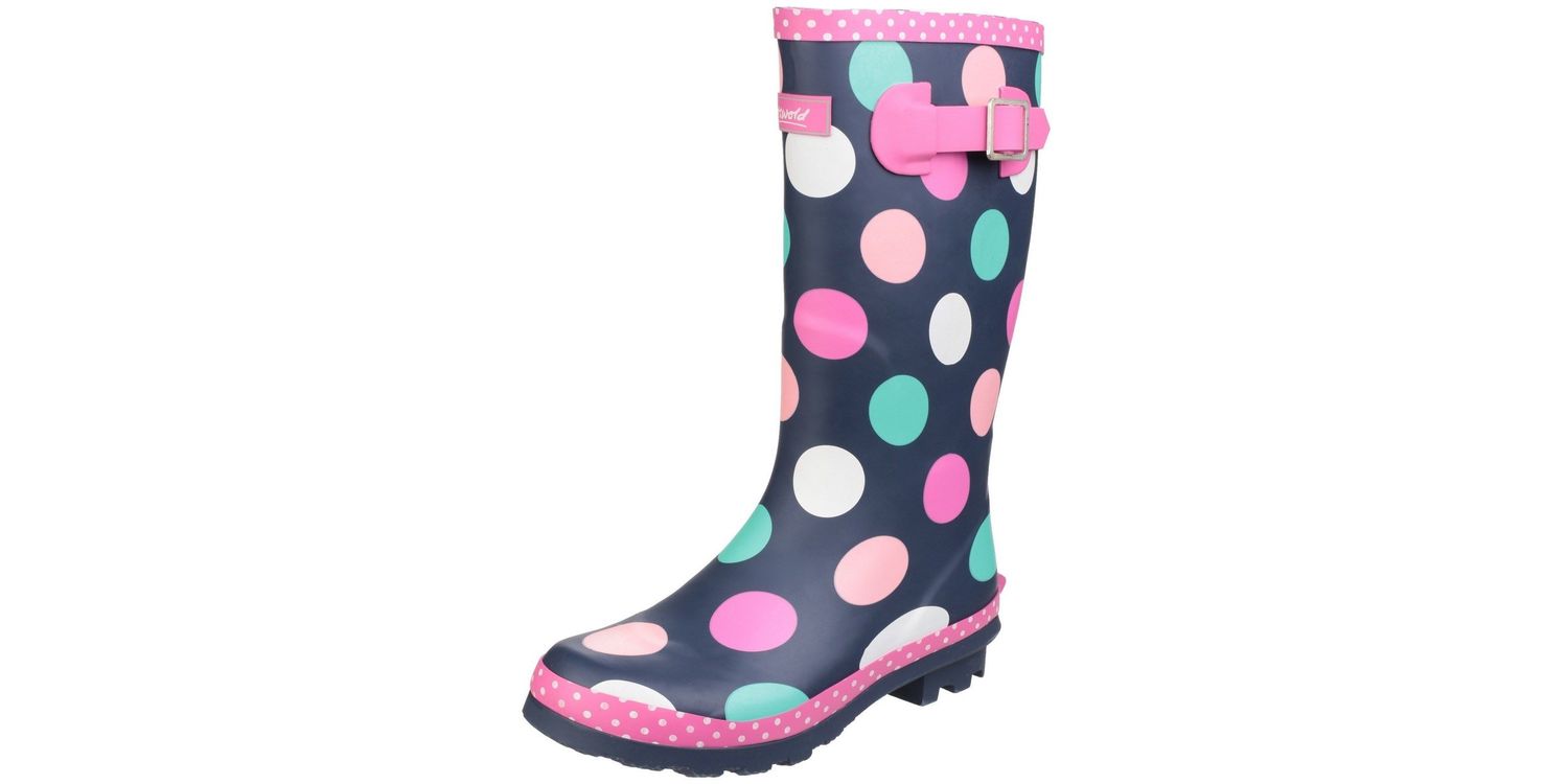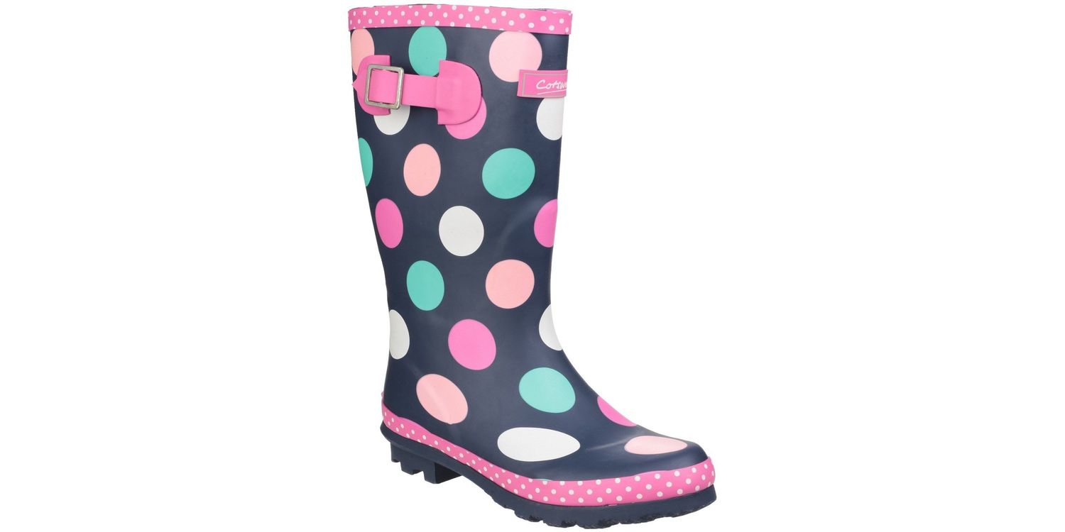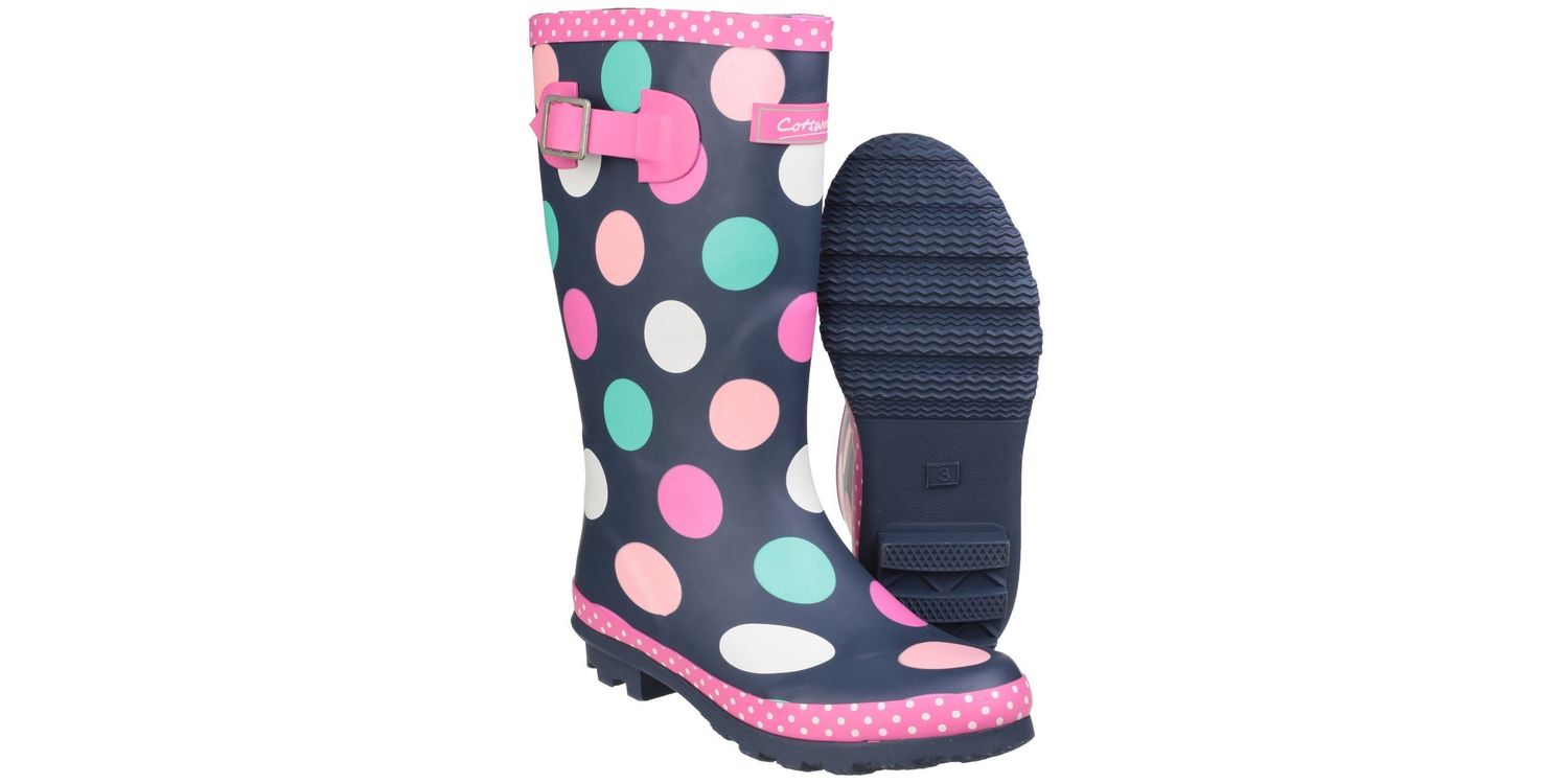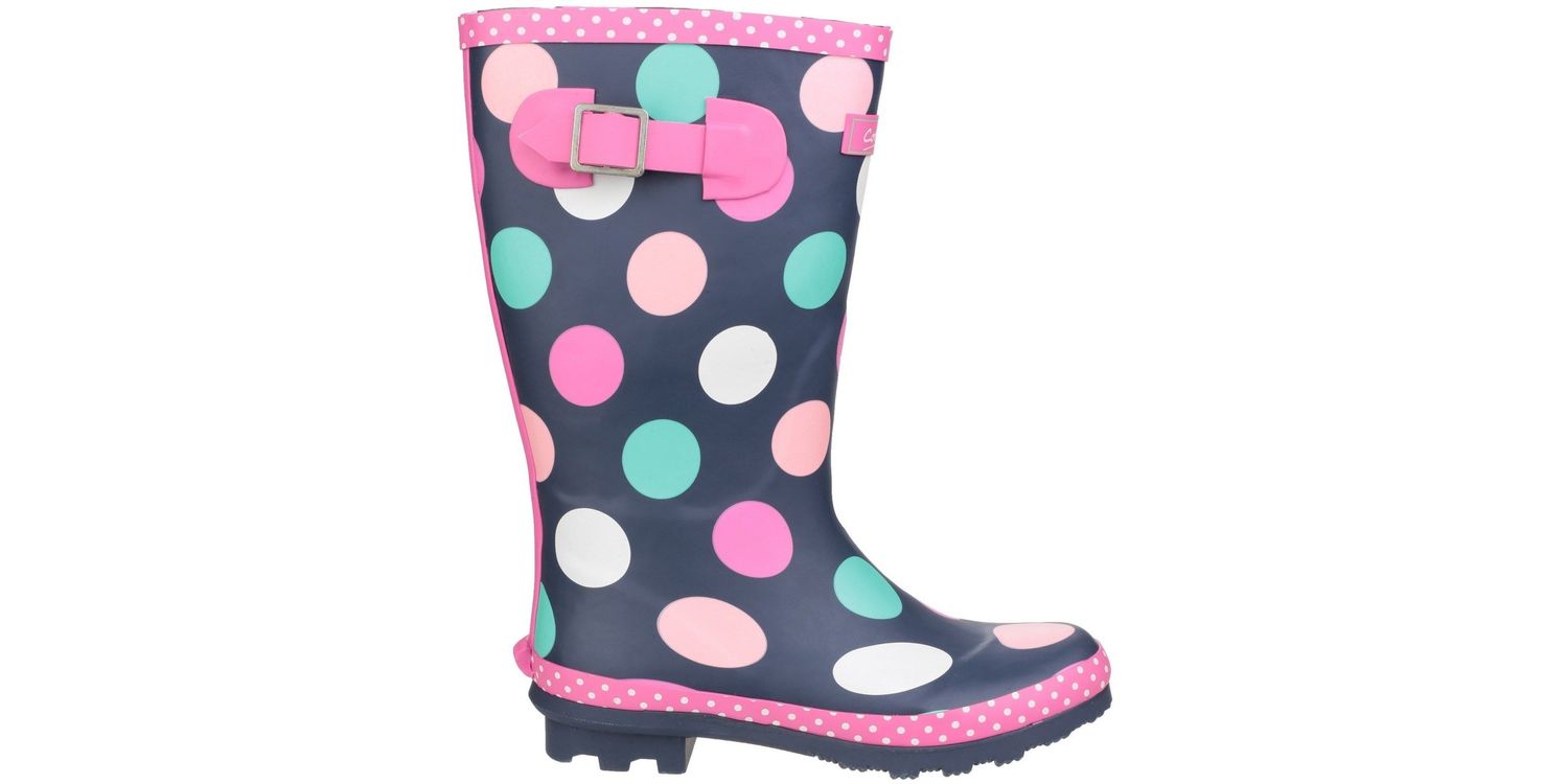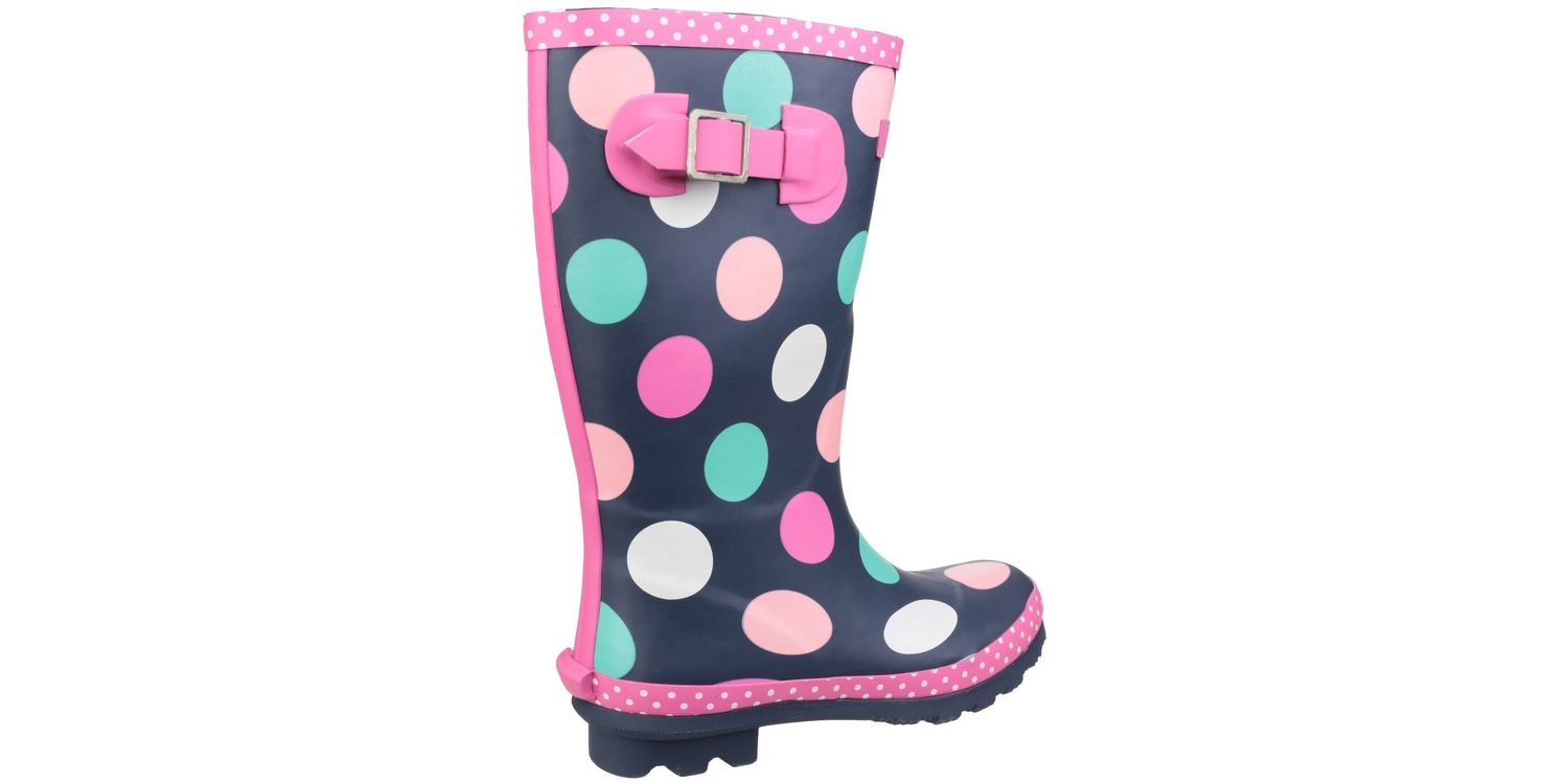The Dotty Children's Pull-On Multi-Coloured Wellington Boots from Cotswold come in a practical knee-length for junior girls who are looking to add a smattering of pink spots to their wardrobe! Designed in a deep wintry navy, decorated with multi-coloured dots, the style also features a fuchsia adjustable buckle at the calf for a perfect fit. This fun design is textile lined with a removable insole and the rubber traction sole is finished with a chunky cleated heel.