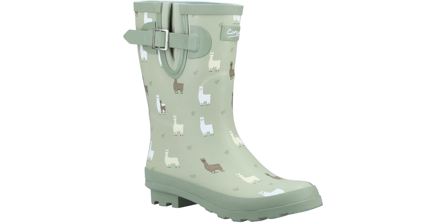 Women's mid height boot with extra-fit adjustment at the calf. Fully waterproof rubber upper with colourful printed pattern. Practical cleated sole with stylish chunky 25mm heel. An ideal women's festival welly, gardening boot or for walking the dog.