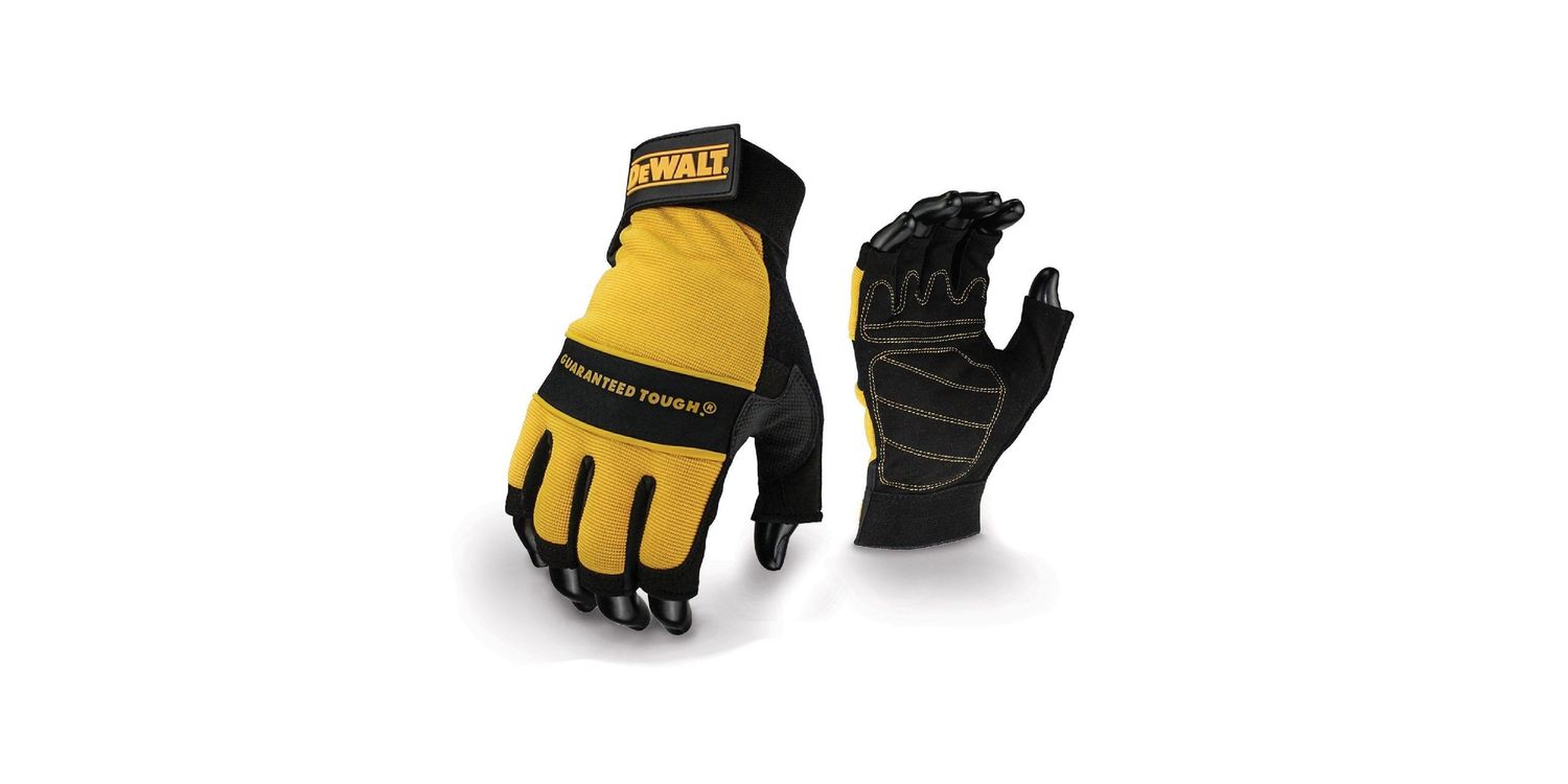 DeWalt Fingerless Performance glove for a comfortable and secure fit in all utility work environments with natural dexterity. modern fingerless glove design. neoprene knuckle guard. Spandex back for added breathability and comfort. padded palm guards. double stitching for added strength.hook and loop wrist closure for secure fit.EN420 and EN388.Size 9 Large. Synthetic Leather/Spandex/Neoprene/Fabric.