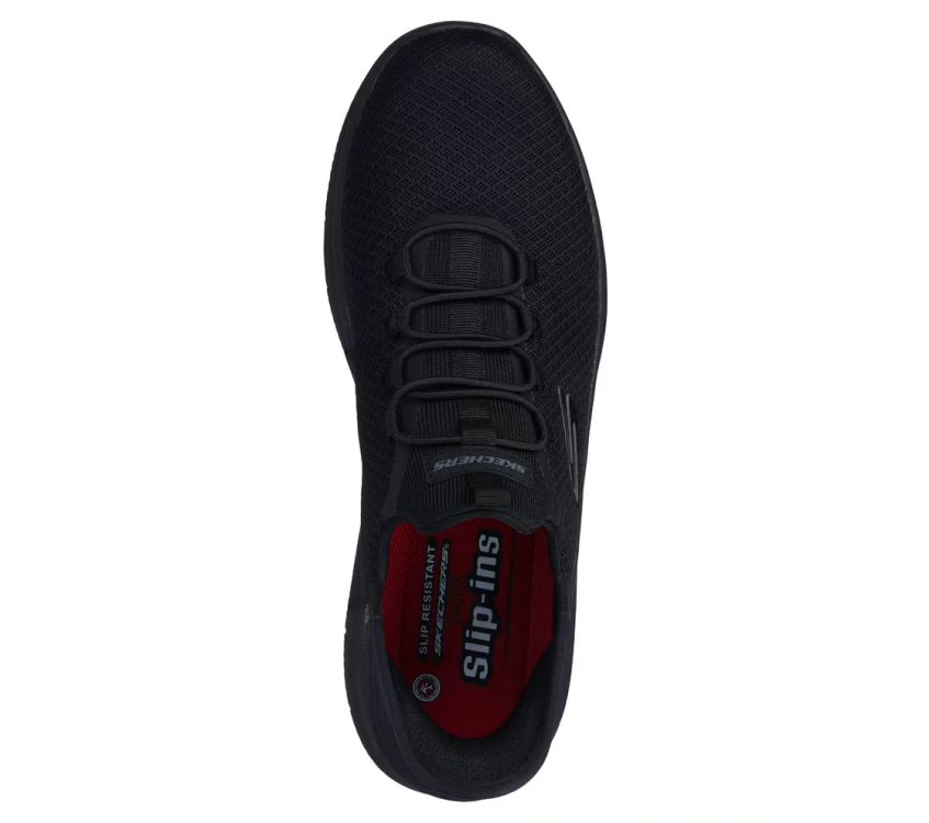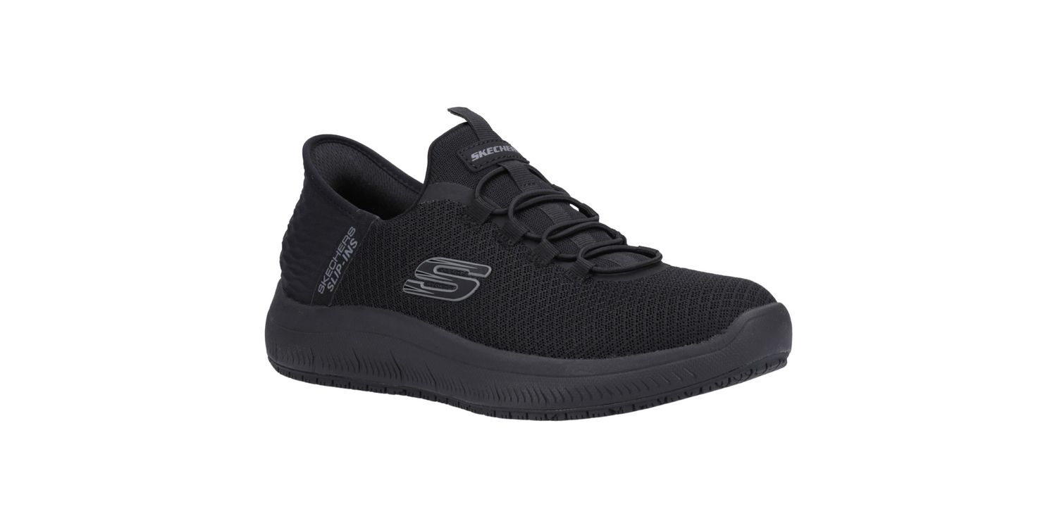 Experience slip-resistant safety with slip-on convenience wearing Skechers Men's Black Summits - Colsin Work Shoe. This slip-on work style features a knit mesh and synthetic upper with a unique Skechers Slip-ins moulded heel panel.